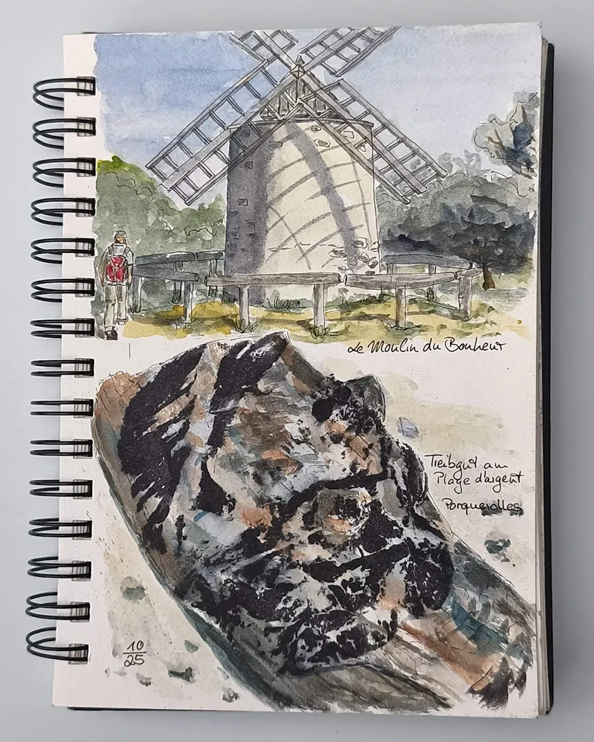 Zur Moulin de Bonheur muss man ein Stück bergauf gehen von Poquerolles, aber der Weg lohnt sich. Fast daneben kann man das Fort Sainte-Agathe besichtigen. Unten der Abdruck eines Treibgutes am Plage d’Argent.