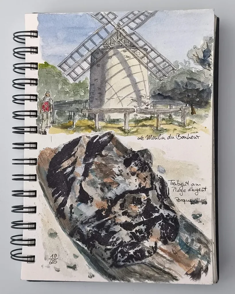Zur Moulin de Bonheur muss man ein Stück bergauf gehen von Poquerolles, aber der Weg lohnt sich. Fast daneben kann man das Fort Sainte-Agathe besichtigen. Unten der Abdruck eines Treibgutes am Plage d’Argent.